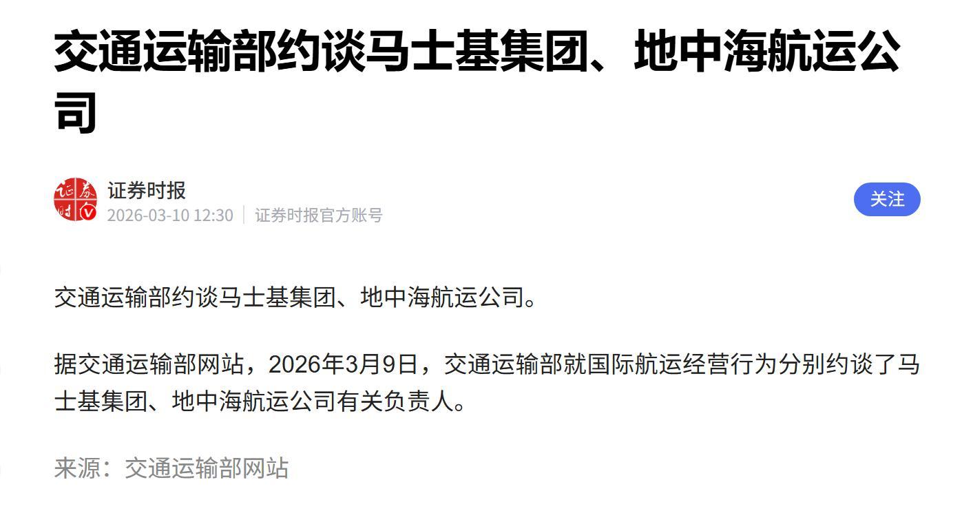 3月9日,中国交通运输部约谈马士基与地中海航运两家全球航运巨头,释放的信号清晰而坚定。